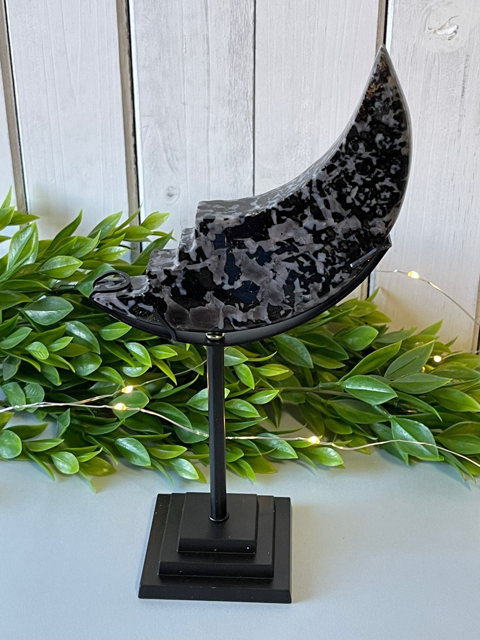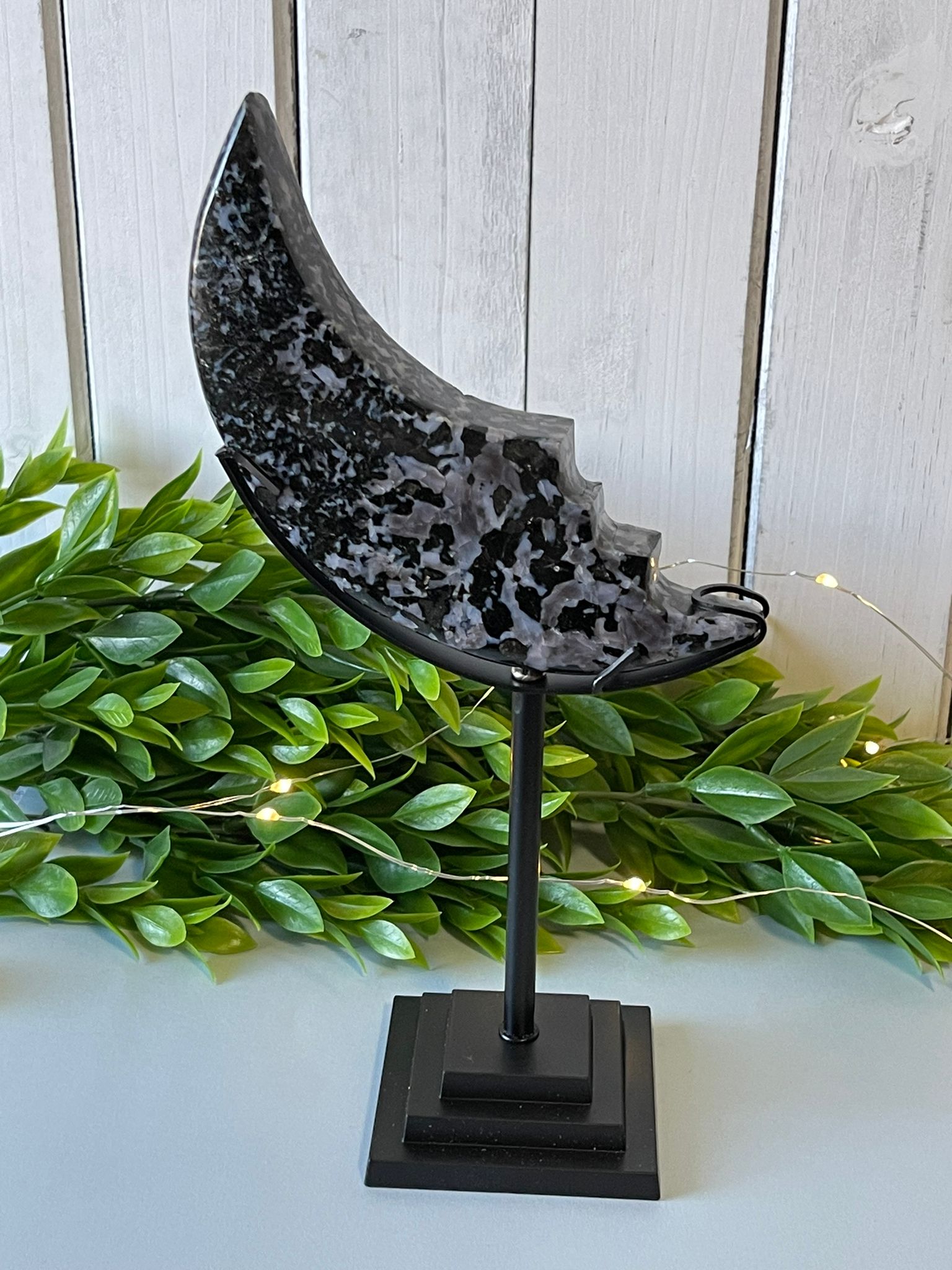 Welcome to the mystifying world of the Indigo Gabbro Moon! This one-of-a-kind crystal boasts a mesmerizingly dark hue and otherworldly beauty that's sure to captivate any crystal collector. Gaze into its indigo depths and be transported to the furthest reaches of the universe!